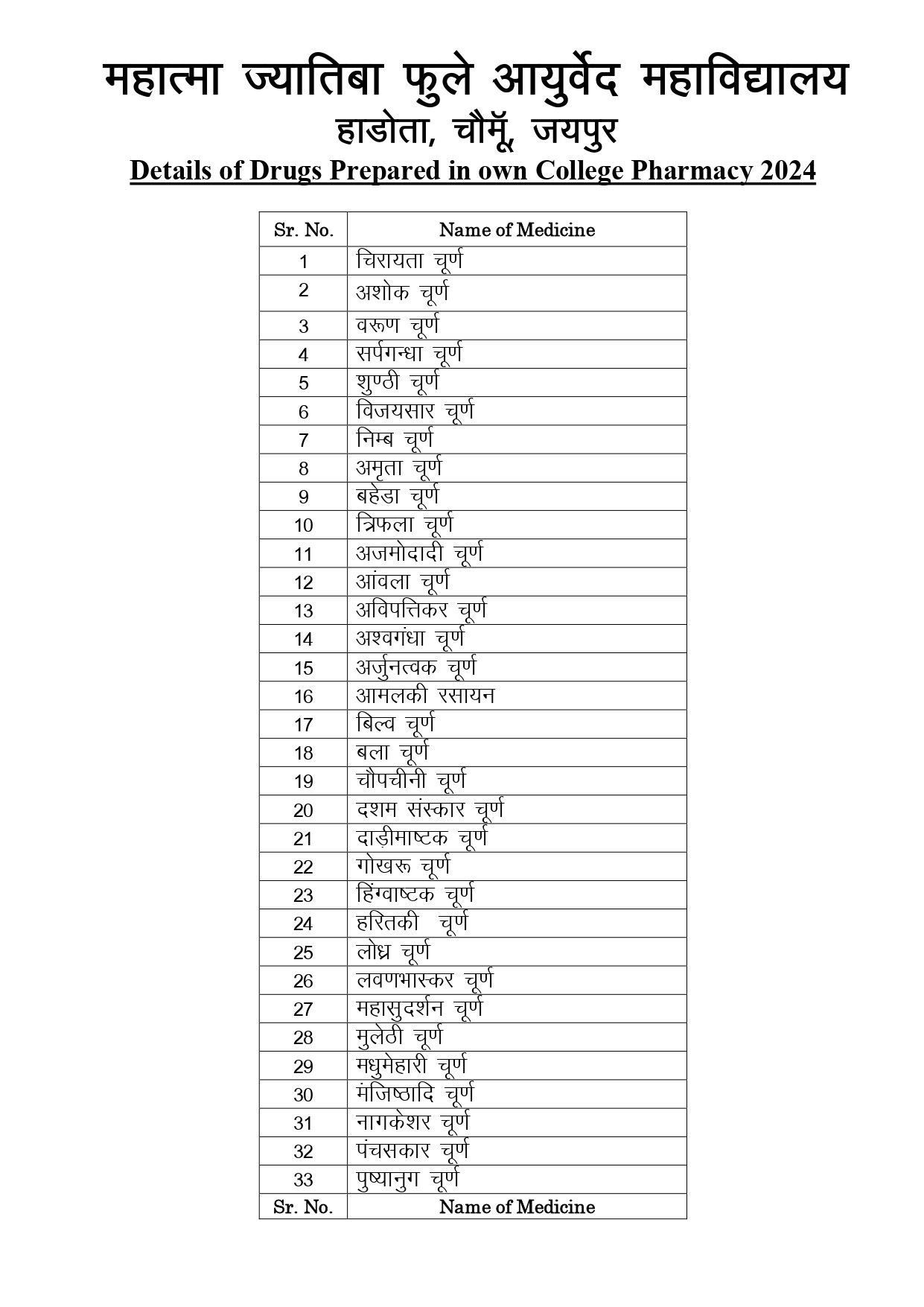 List of Medicine Prepared in pharmacy in the session 2024-25 Click on Here