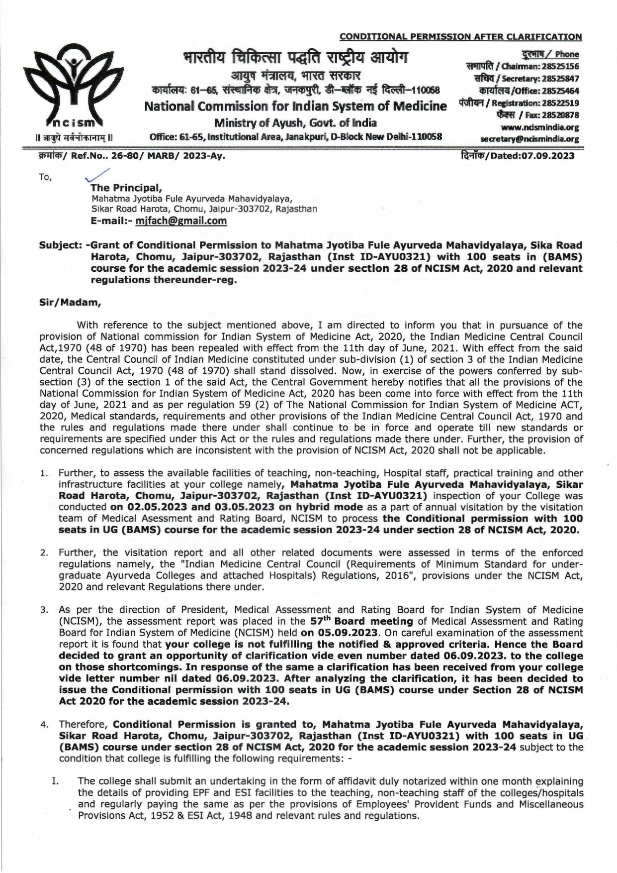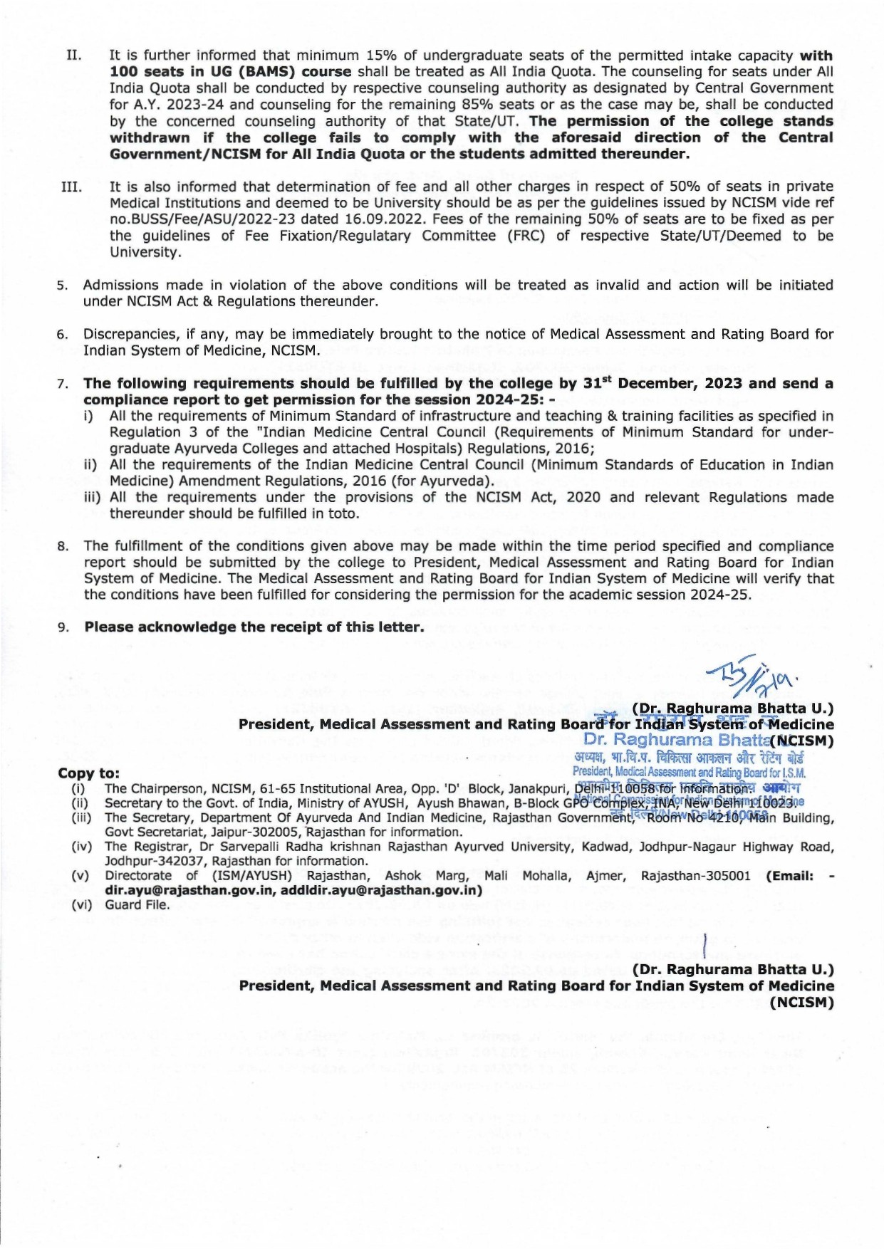 Session 2023-24 - Letter of Permission (LOP) granted by Department of AYUSH, Government of India for 100 seats capacity of BAMS ( to view click here )