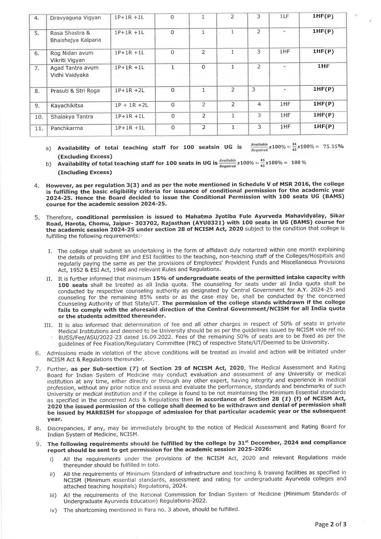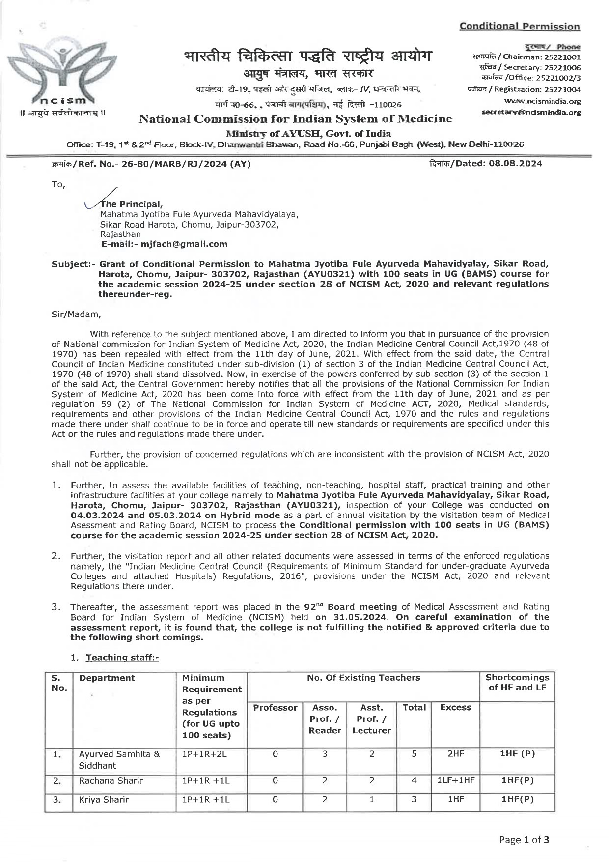 The Recognition status of Mahatma Jyotiba Fule Ayurveda Mahavidyalaya, Harota, Chomu , Jaipur, Rajasthan are as below :-