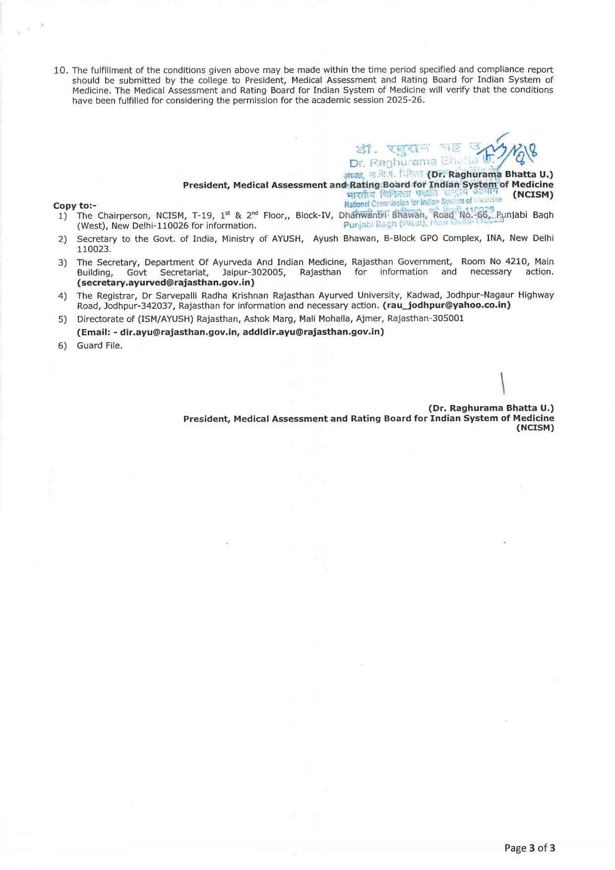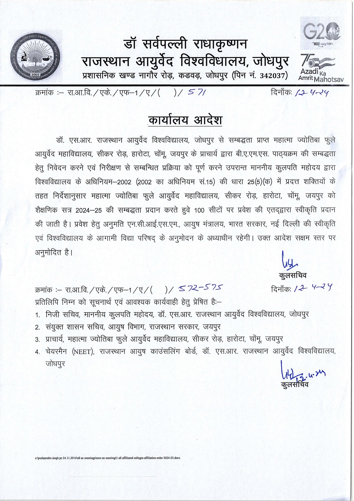 The college is affiliated for 100 seat intake capcity with the Dr. Sarvapalli Radha krishan Rajasthan Ayurveda, Jodhpur from the session 2014-15 to 2022-23 session & the degree to students will be awarded by this university.