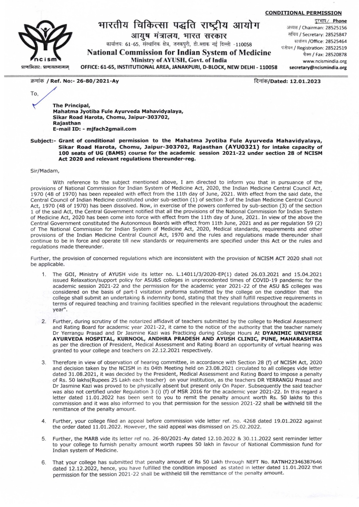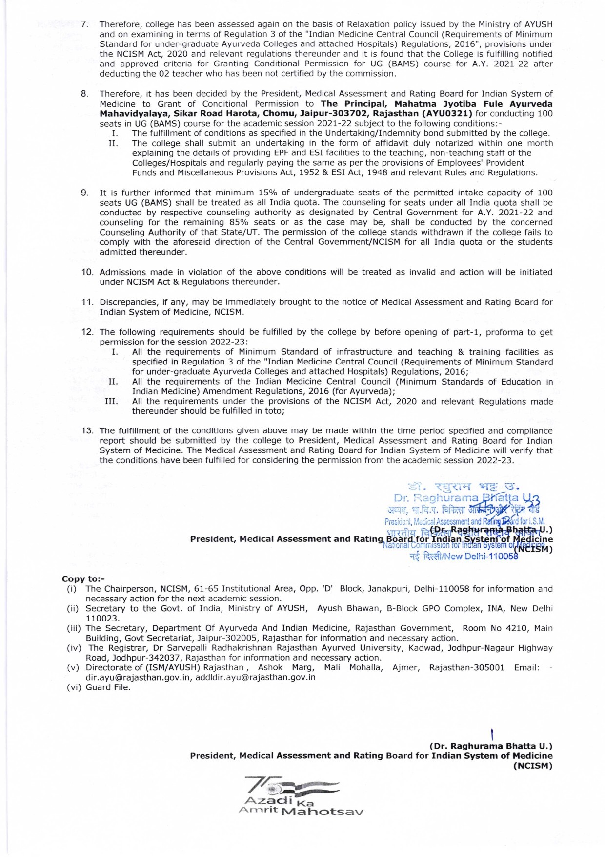 Session 2021-22 - Letter of Permission (LOP) granted by Department of AYUSH, Government of India for 100 seats capacity of BAMS ( to view click here )